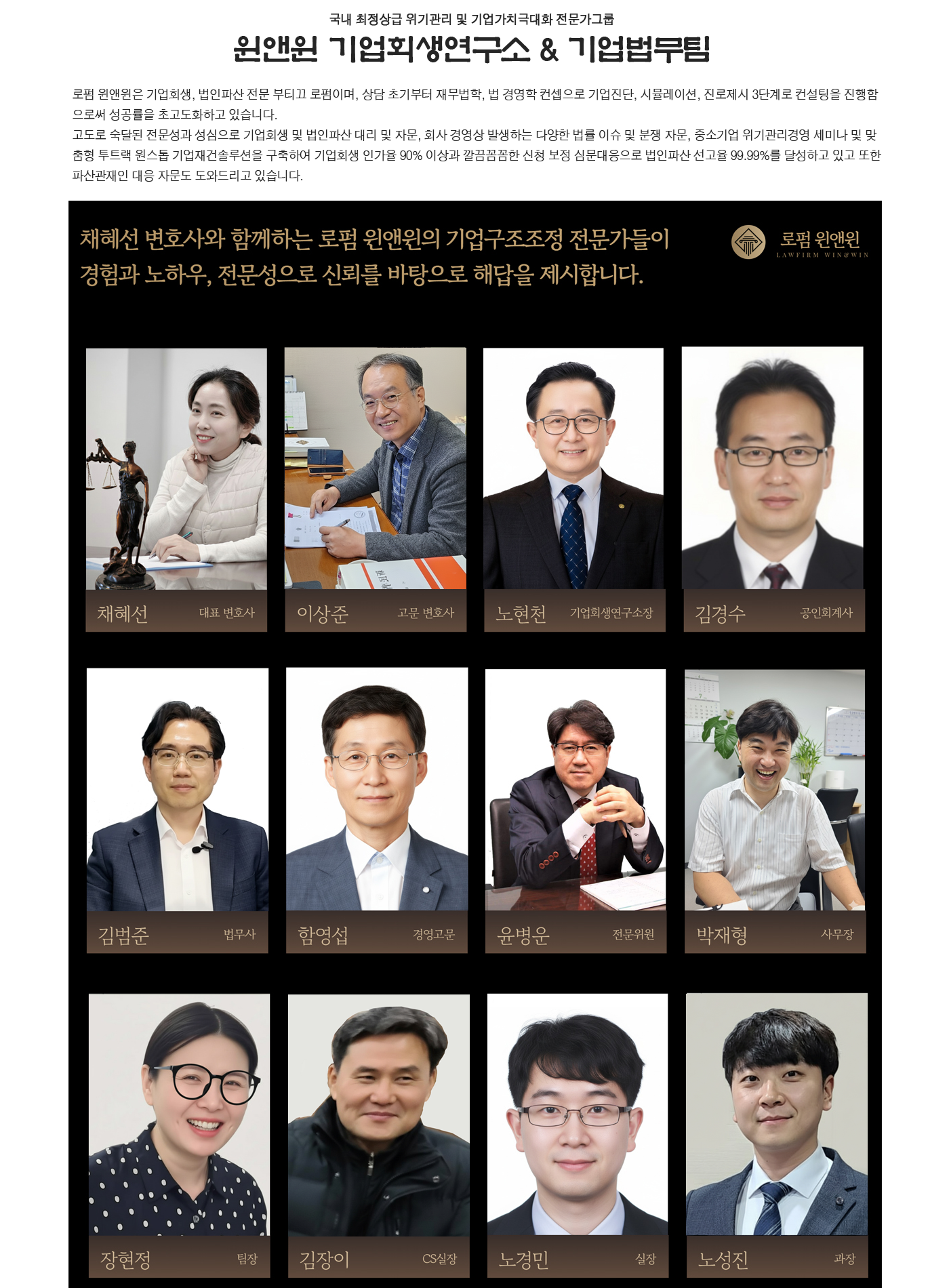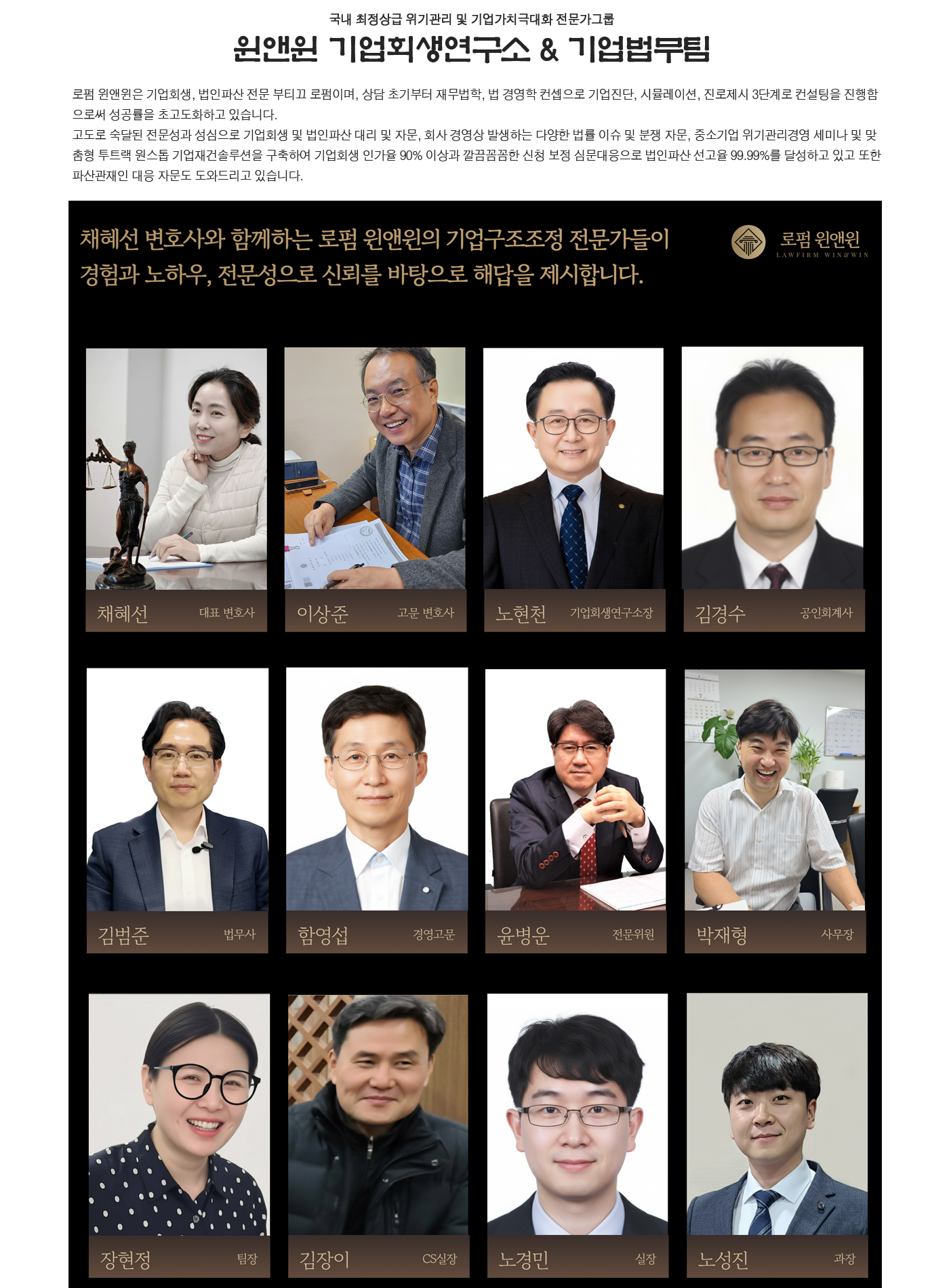 로펌 윈앤윈 | 대표자: 채혜선 | (06634) 서울특별시 서초구 서초중앙로22길 17(서초동), 메가스터디 서초오피스빌딩 2층 TEL : 18111-428(전국대표), (02)588-8114, 010-6541-1145(긴급) | FAX : (02)6008-7116 | E-mail : hoisaeng@naver.com 광고책임 : 변호사 채혜선 Copyright (c) 2023 로펌 윈앤윈 변호사 채혜선 기업회생연구소(Joseph) All Rights Reserved.